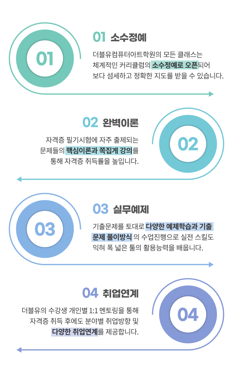 소수정예로 진행되는 더블유컴퓨터아트학원의 수업을 통해 수강생은 구체적이고 섬세한 지도를 받을 수 있습니다. 강사 또한 개개인을 위한 수업지도에 집중할 수 있도록 커리큘럼이 구성되어 있어 더블유컴퓨터아트학원은 매 회 90% 이상의 자격증 취득률을 유지하고 있습니다.